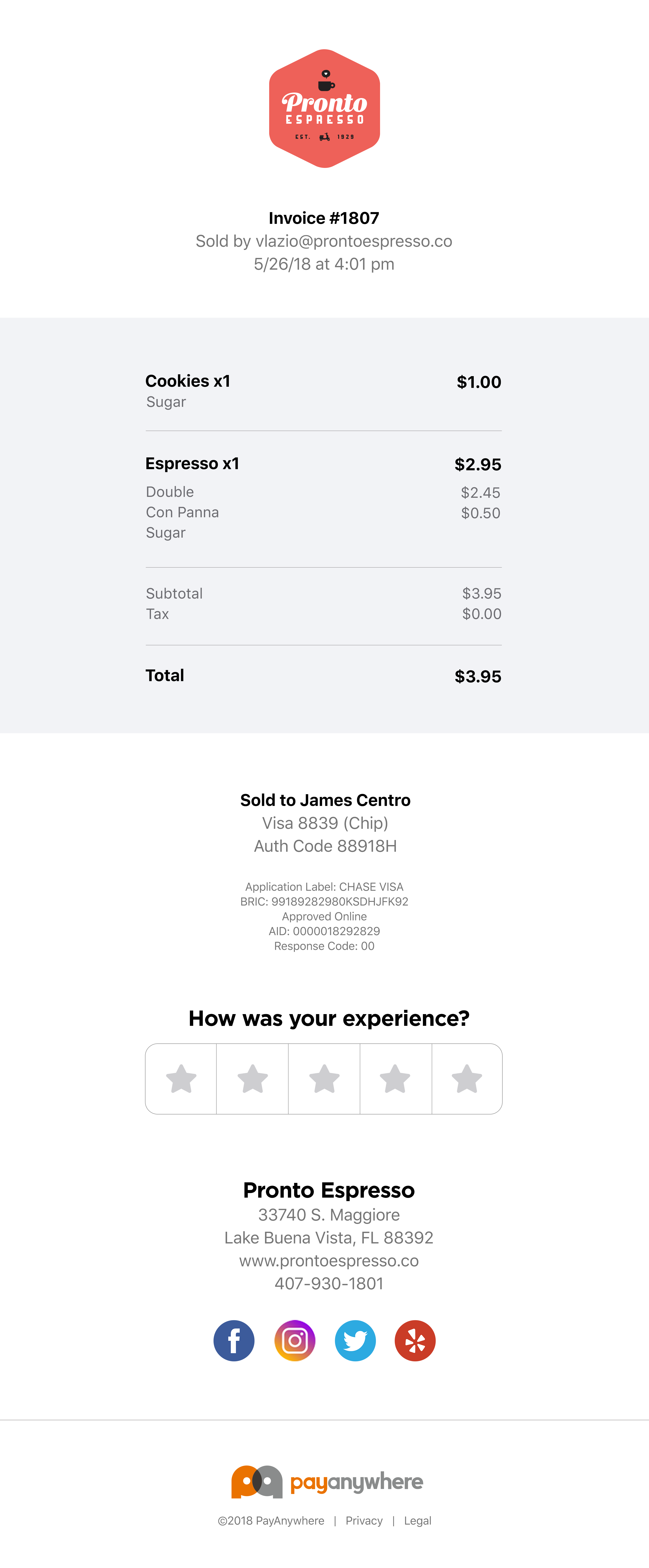 At PayAnywhere, we’re consistently trying to create a streamlined and simple way for you to manage your business. Meaning, you need a simple, clean receipt that can be emailed, sent via text, or printed for your customers.