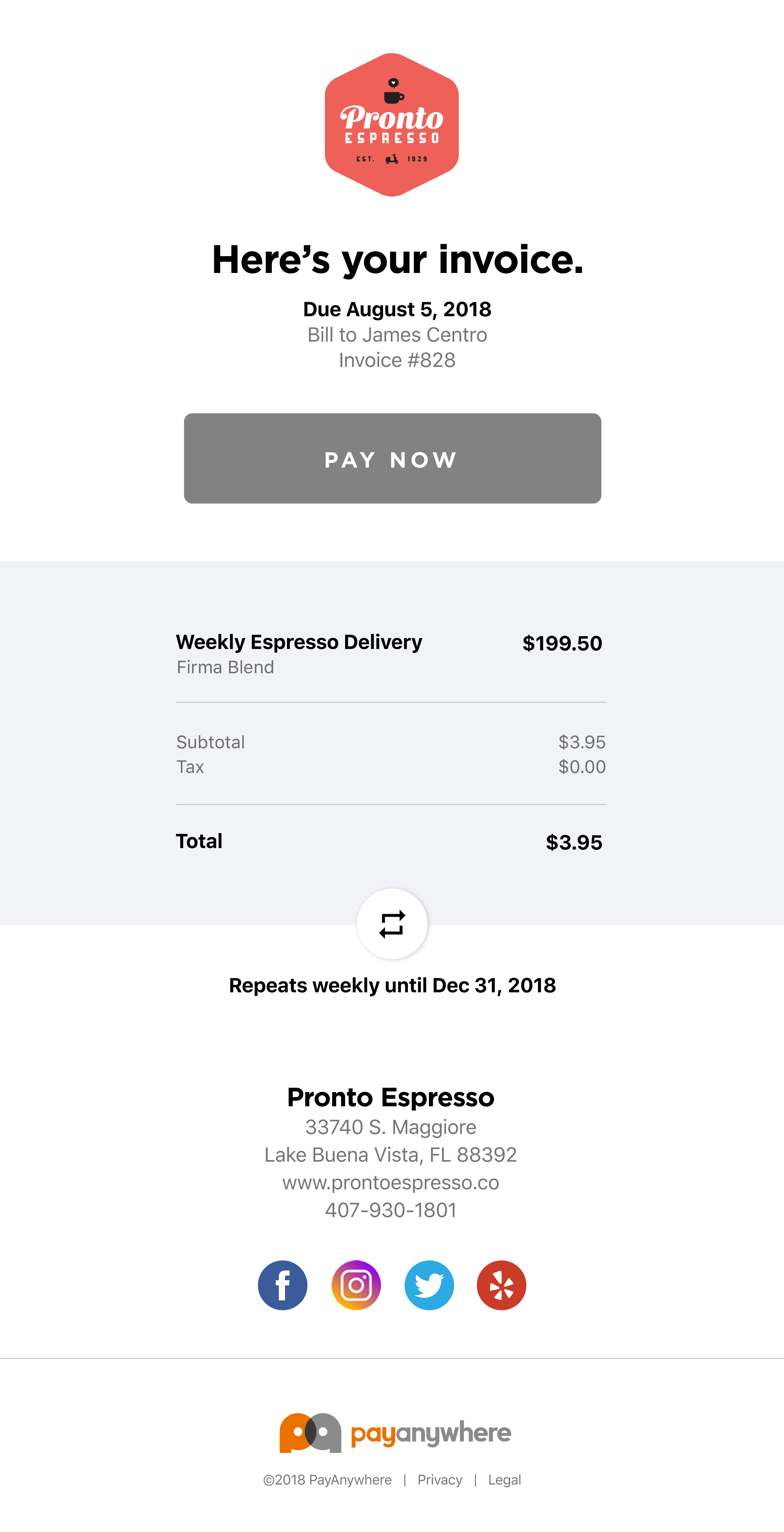 Stop chasing your customers for payments and start sending invoices from Payanywhere Inside. Invoices allow your customers to pay on their own time through a secure payments page instead of needing to make a phone call or visiting your place of business. They even have the option to set up autopay for recurring invoices! To send an invoice, log in to Payanywhere Inside and head to Business → Invoices.
