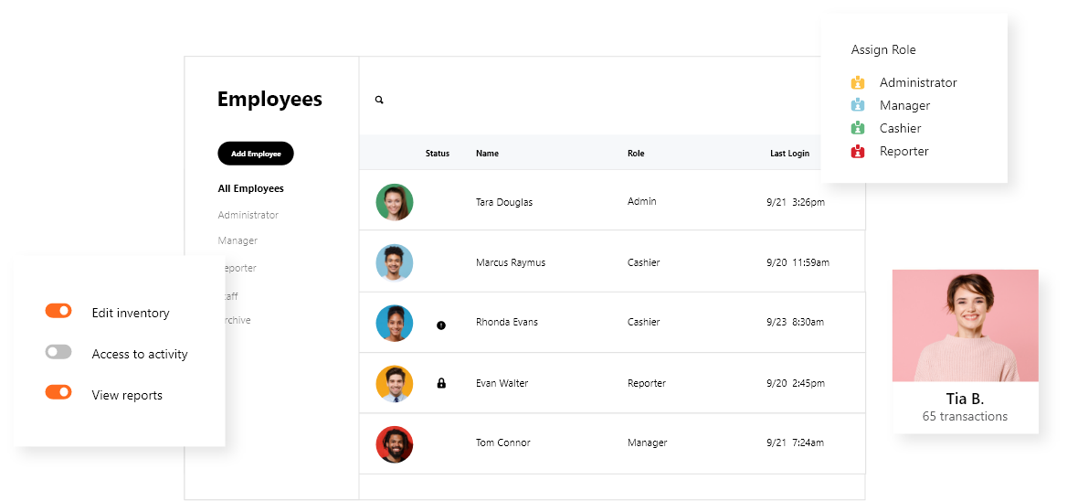 Avoid losses and track employee activity by customizing who can log in, complete a sale, issue a refund, and update stock counts.