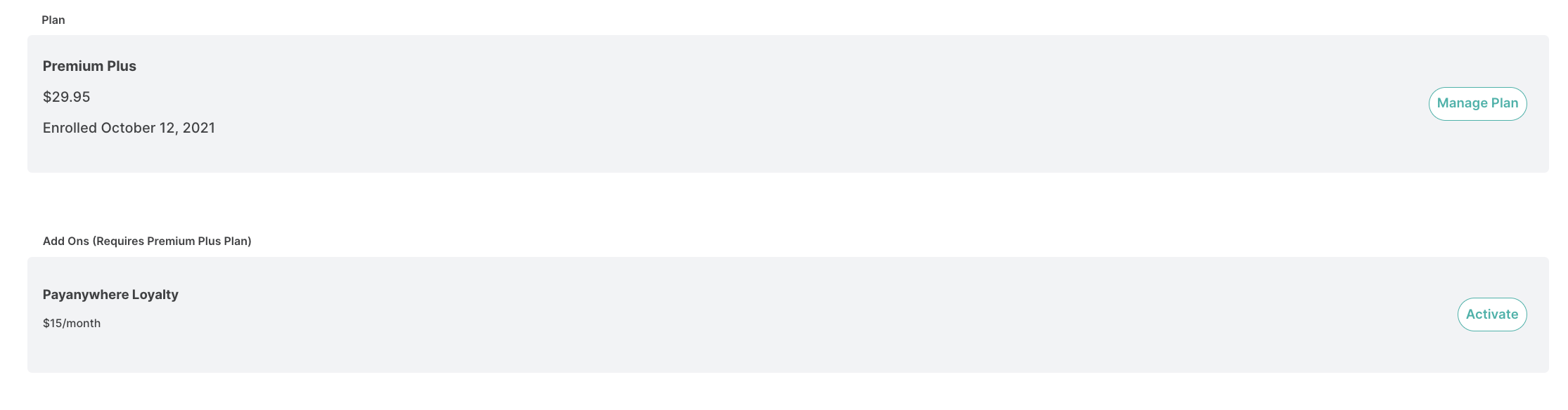 To Activate this feature, head to Payments Hub → Customers → Loyalty Program or your User Settings. Payanywhere Loyalty is an add-on feature that needs to be activated/deactivated separately from your Plan Type in User Settings.