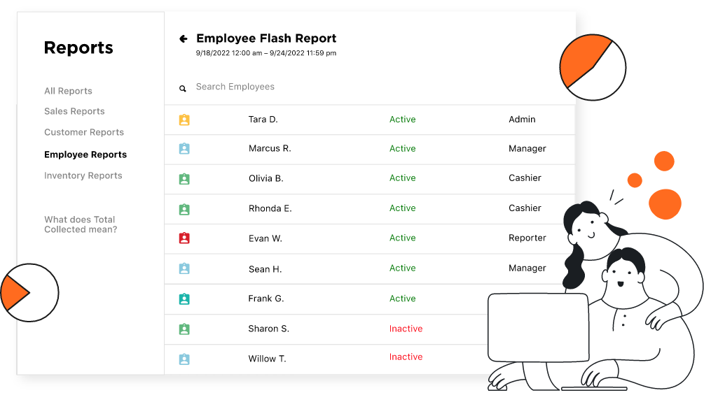 Generate reports on individuals or groups of employees by transactions completed, volume sold, tips, payment method, and more.