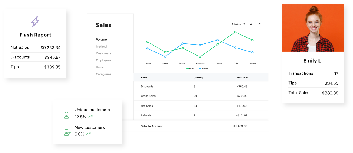 See trends and compare to historic sales for volume, payment type, customers, employees, and inventory based on your sales data.